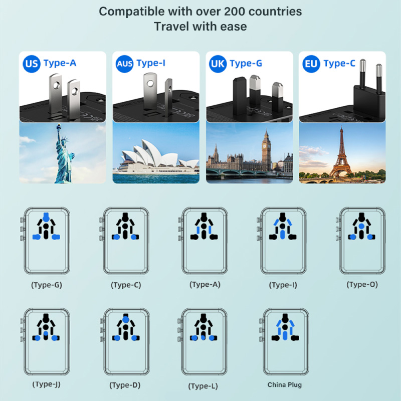 UsB-C + 2USB-A, transformable EU/UK/US/P plugs