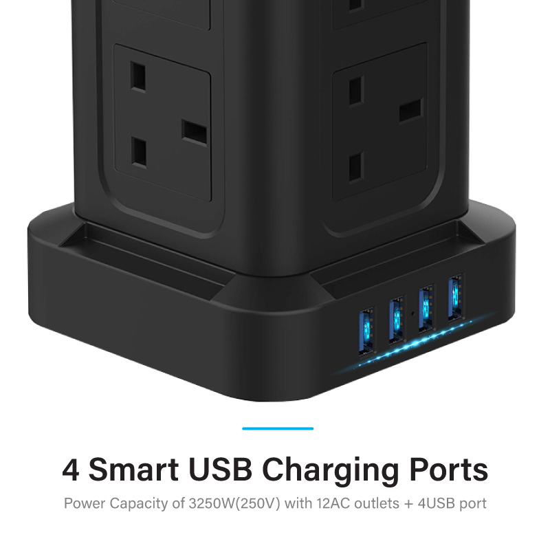 2. 13A Max 3250W(250V), 12AC outlets + 4USB ports